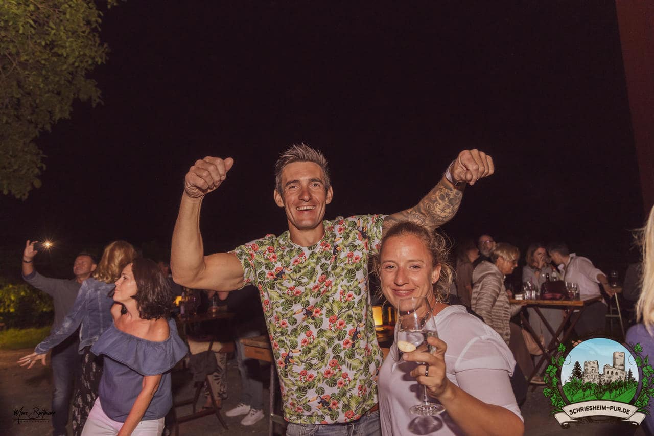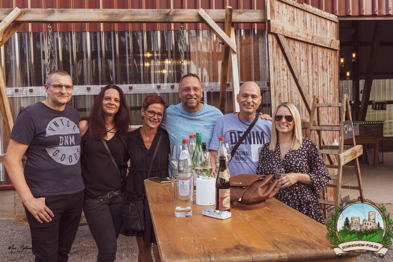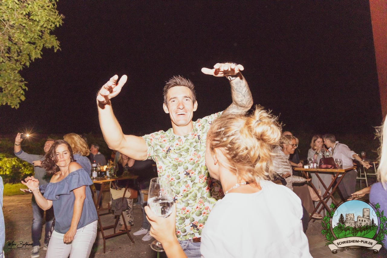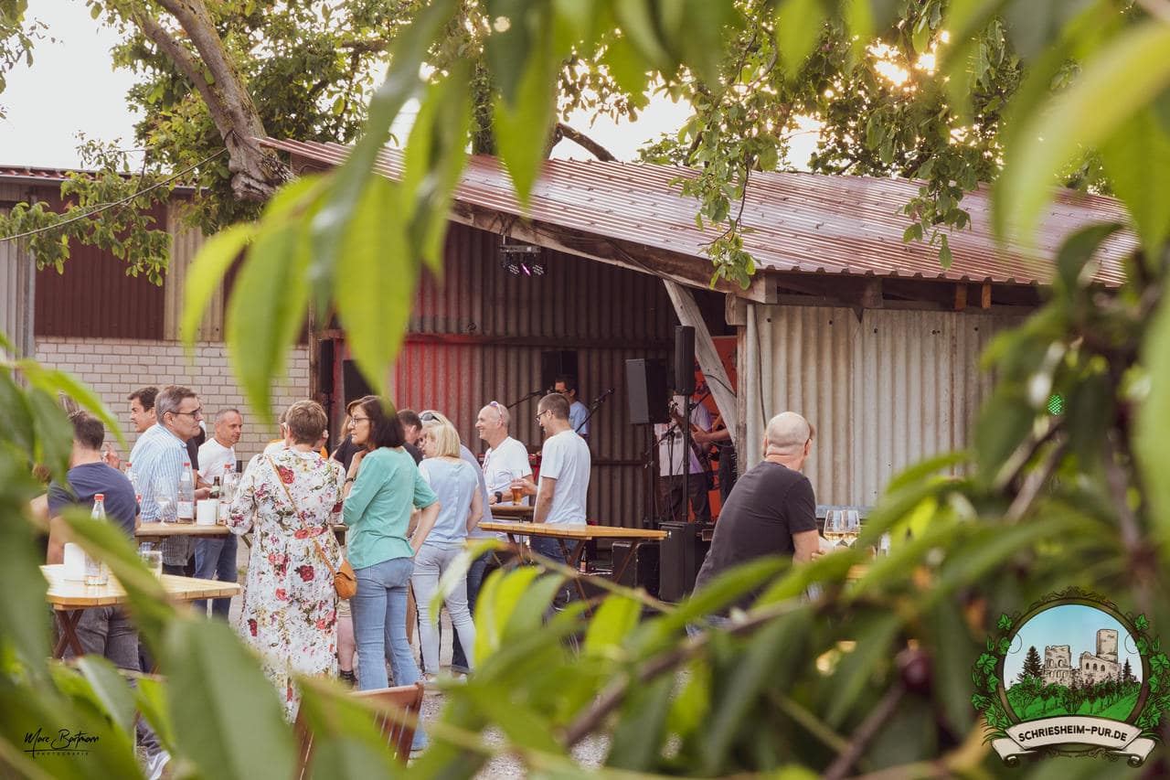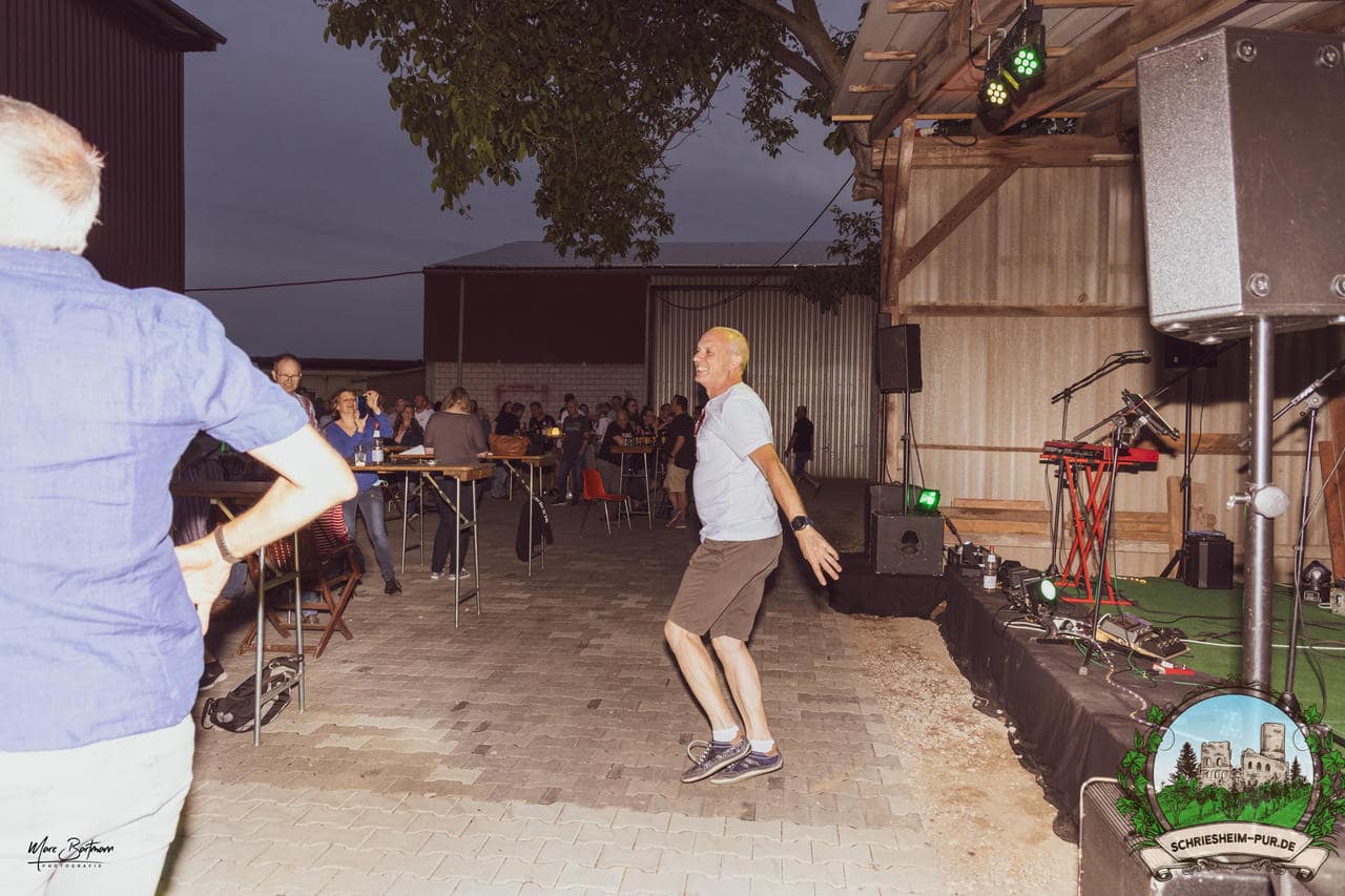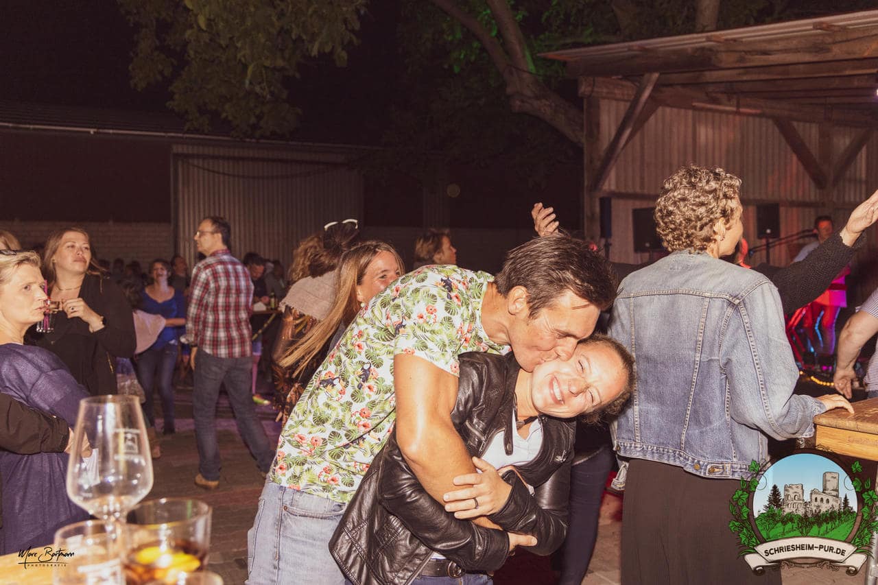 Rund 230 Besucher machten sich auf zum Obsthof Spieß zum Feiern und genießen. Natürlich unter der Einhaltung der drei G´s. Genesen, getestet oder geimpft. Und die Leute feierten ihre wieder erlangte Freiheit in vollen Zügen. Endlich einmal wieder Bekannte nach langer Zeit in den Arm nehmen und miteinander mit einem Schriesheimer Wein anstoßen. Was gibt es schöneres? Dazu gab es von der Firma “Gastro GmbH” leckere kleine Gerichte, so war gut für das Wohl gesorgt. Die Krönung des Ganzen war dann die Band “Gonzo´s Jam” die die Hütte rockten.