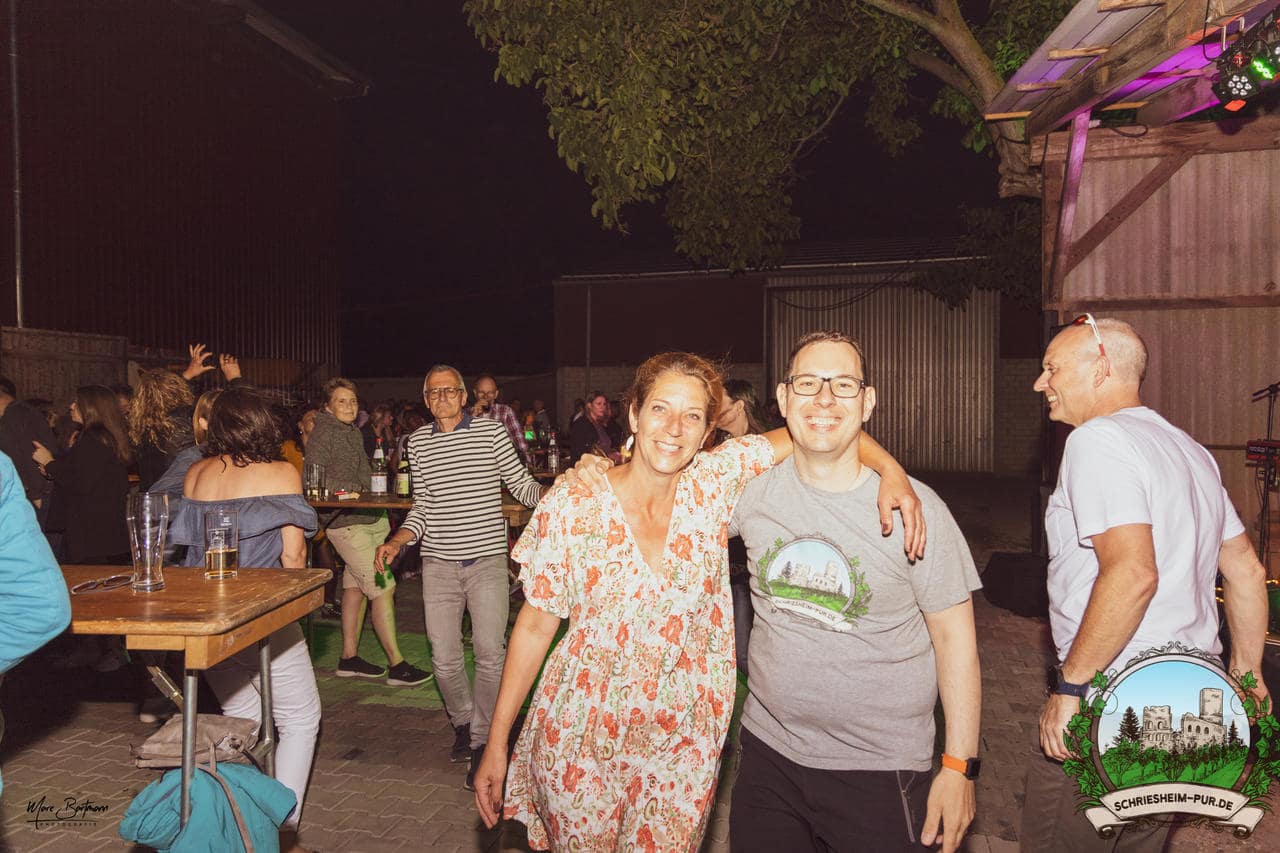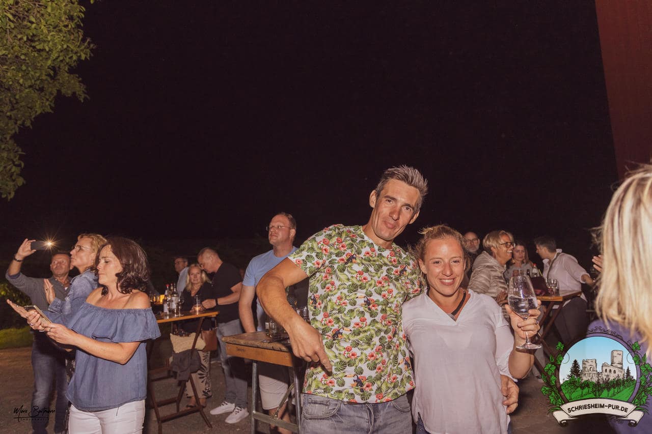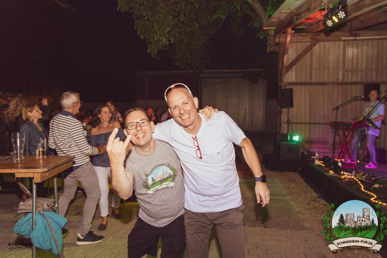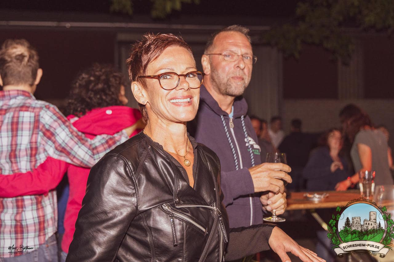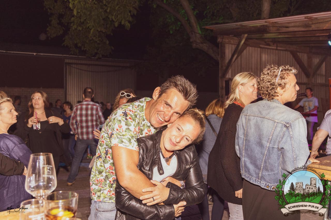Rund 230 Besucher machten sich auf zum Obsthof Spieß zum Feiern und genießen. Natürlich unter der Einhaltung der drei G´s. Genesen, getestet oder geimpft. Und die Leute feierten ihre wieder erlangte Freiheit in vollen Zügen. Endlich einmal wieder Bekannte nach langer Zeit in den Arm nehmen und miteinander mit einem Schriesheimer Wein anstoßen. Was gibt es schöneres? Dazu gab es von der Firma “Gastro GmbH” leckere kleine Gerichte, so war gut für das Wohl gesorgt. Die Krönung des Ganzen war dann die Band “Gonzo´s Jam” die die Hütte rockten.
