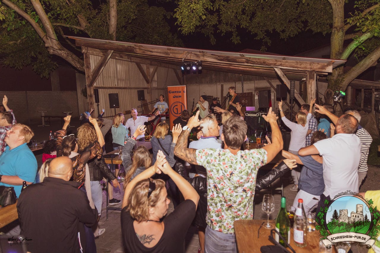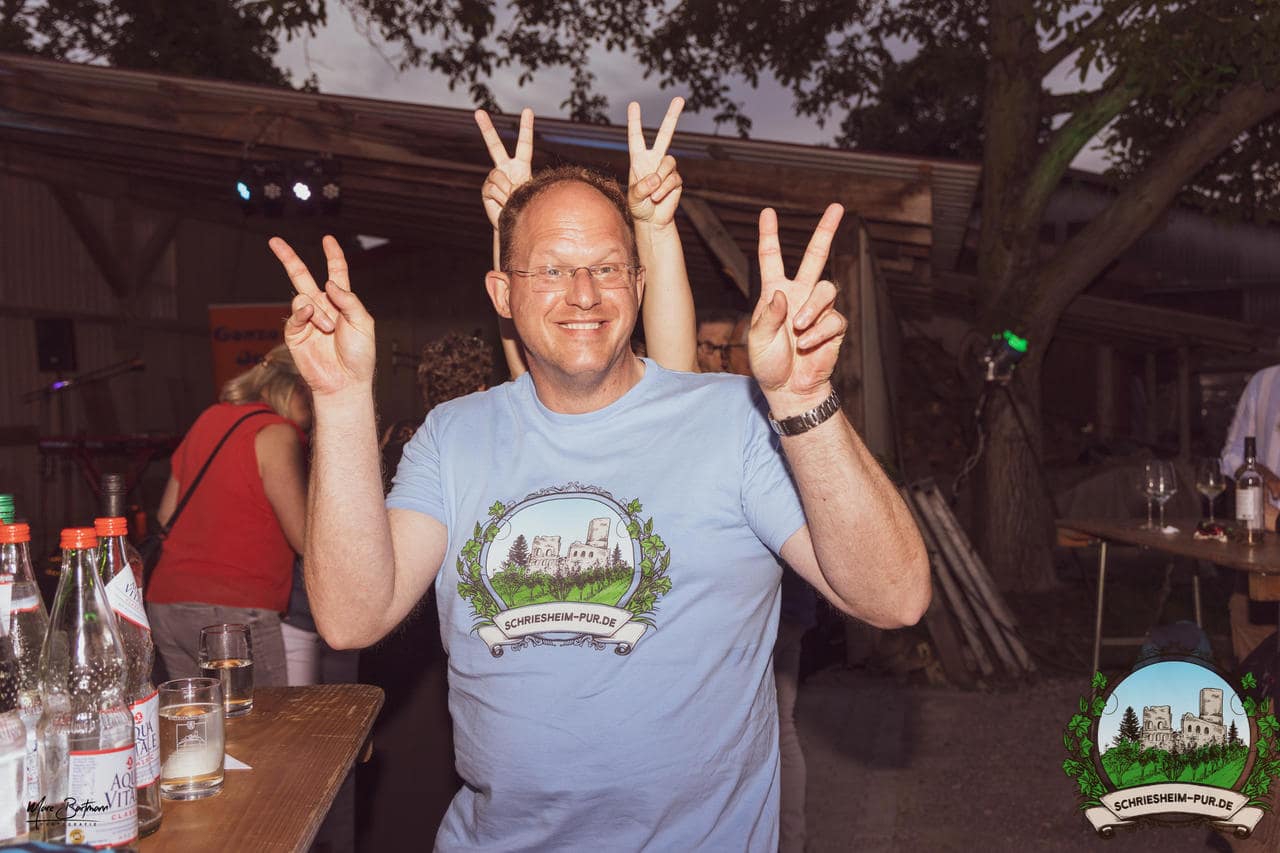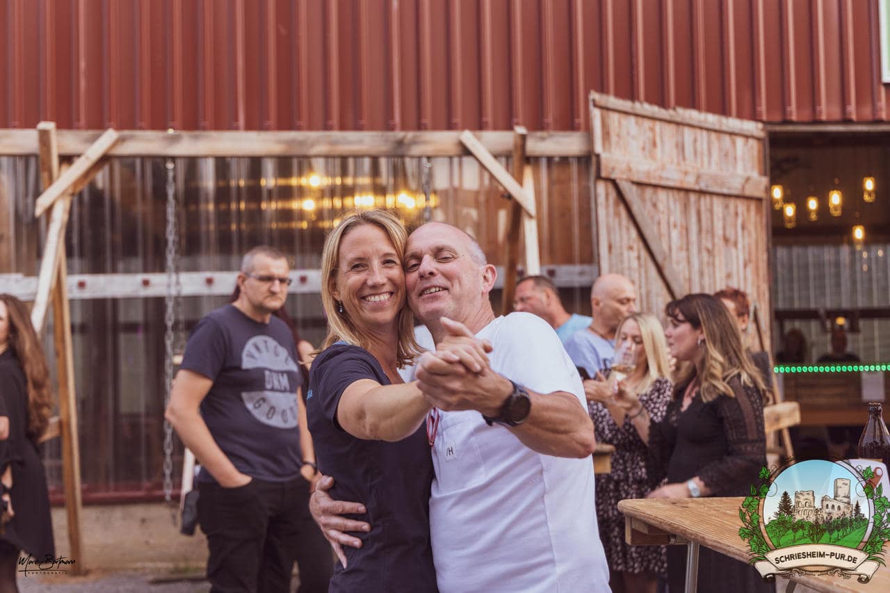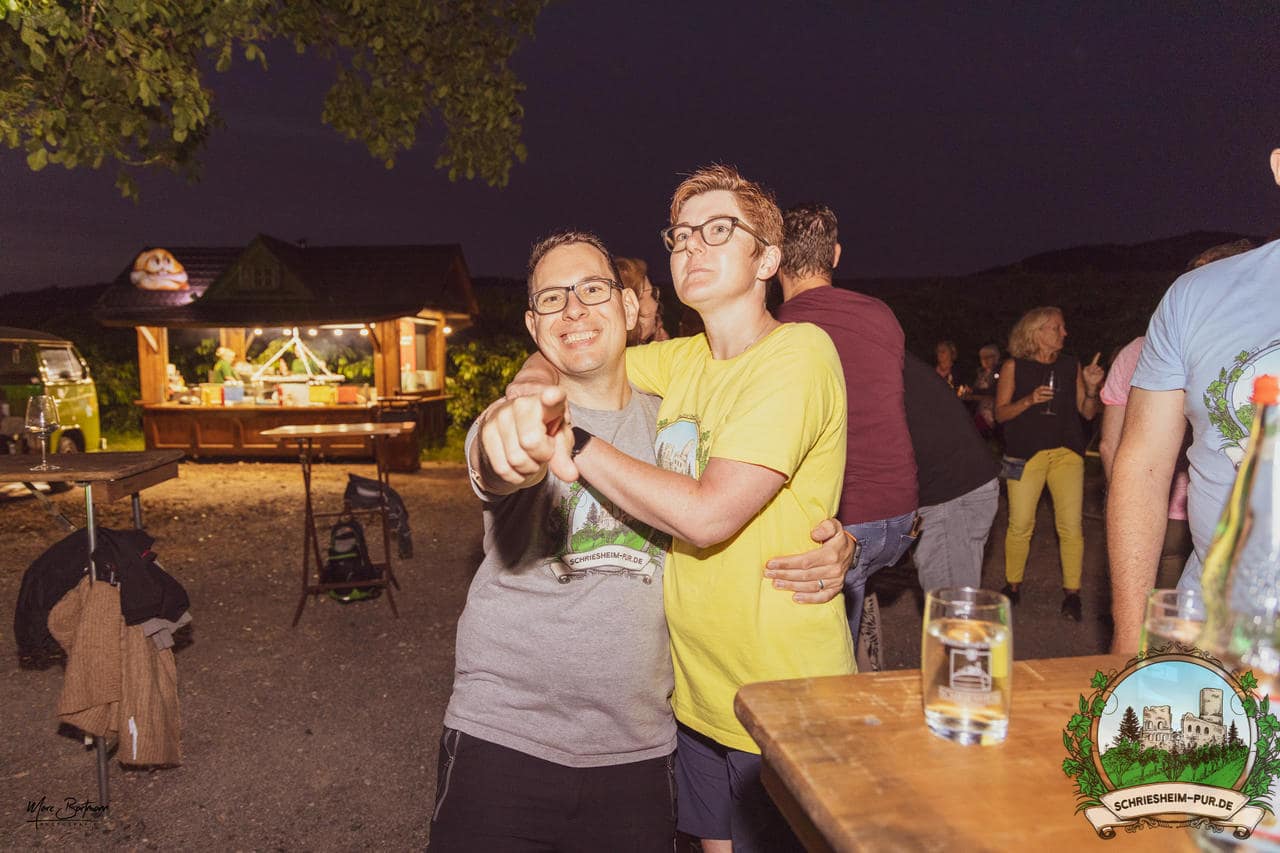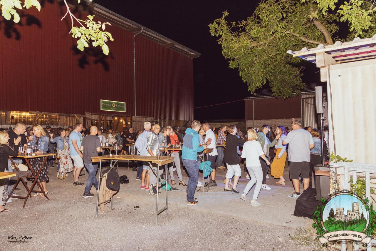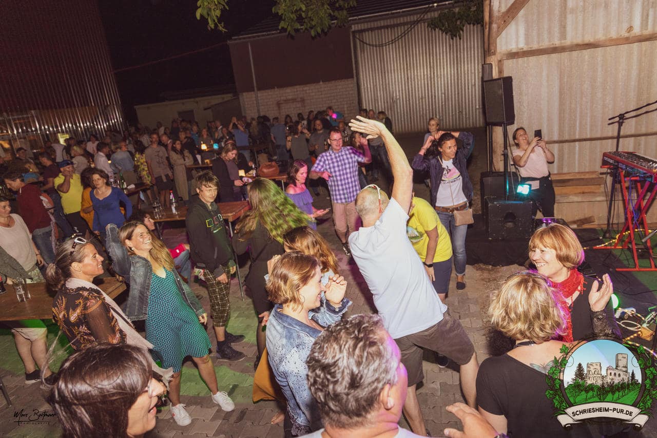 Rund 230 Besucher machten sich auf zum Obsthof Spieß zum Feiern und genießen. Natürlich unter der Einhaltung der drei G´s. Genesen, getestet oder geimpft. Und die Leute feierten ihre wieder erlangte Freiheit in vollen Zügen. Endlich einmal wieder Bekannte nach langer Zeit in den Arm nehmen und miteinander mit einem Schriesheimer Wein anstoßen. Was gibt es schöneres? Dazu gab es von der Firma “Gastro GmbH” leckere kleine Gerichte, so war gut für das Wohl gesorgt. Die Krönung des Ganzen war dann die Band “Gonzo´s Jam” die die Hütte rockten.