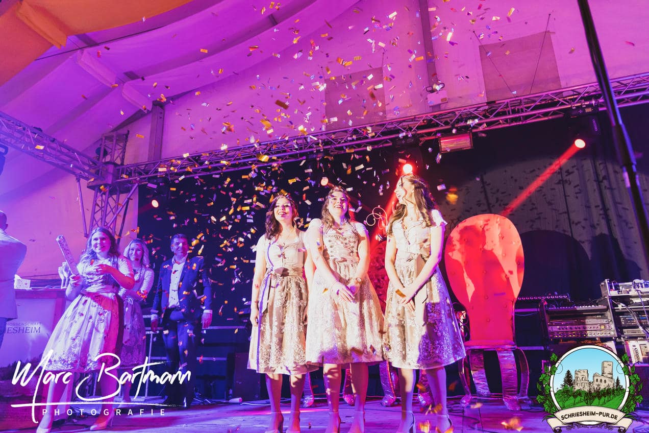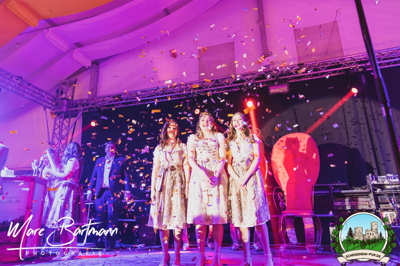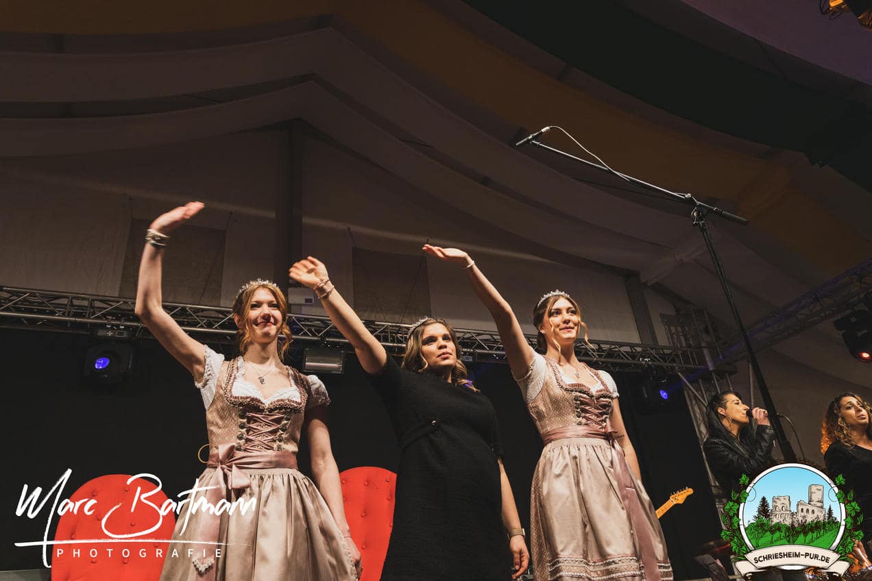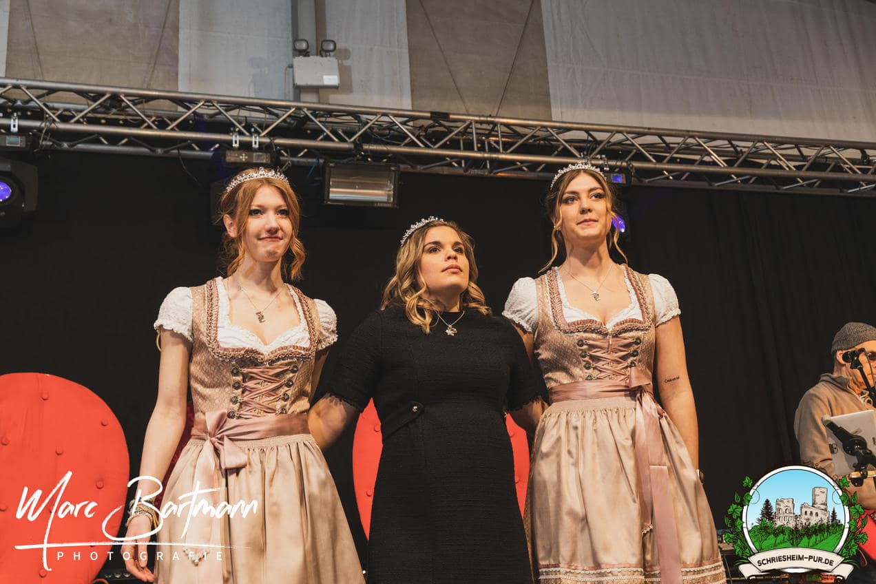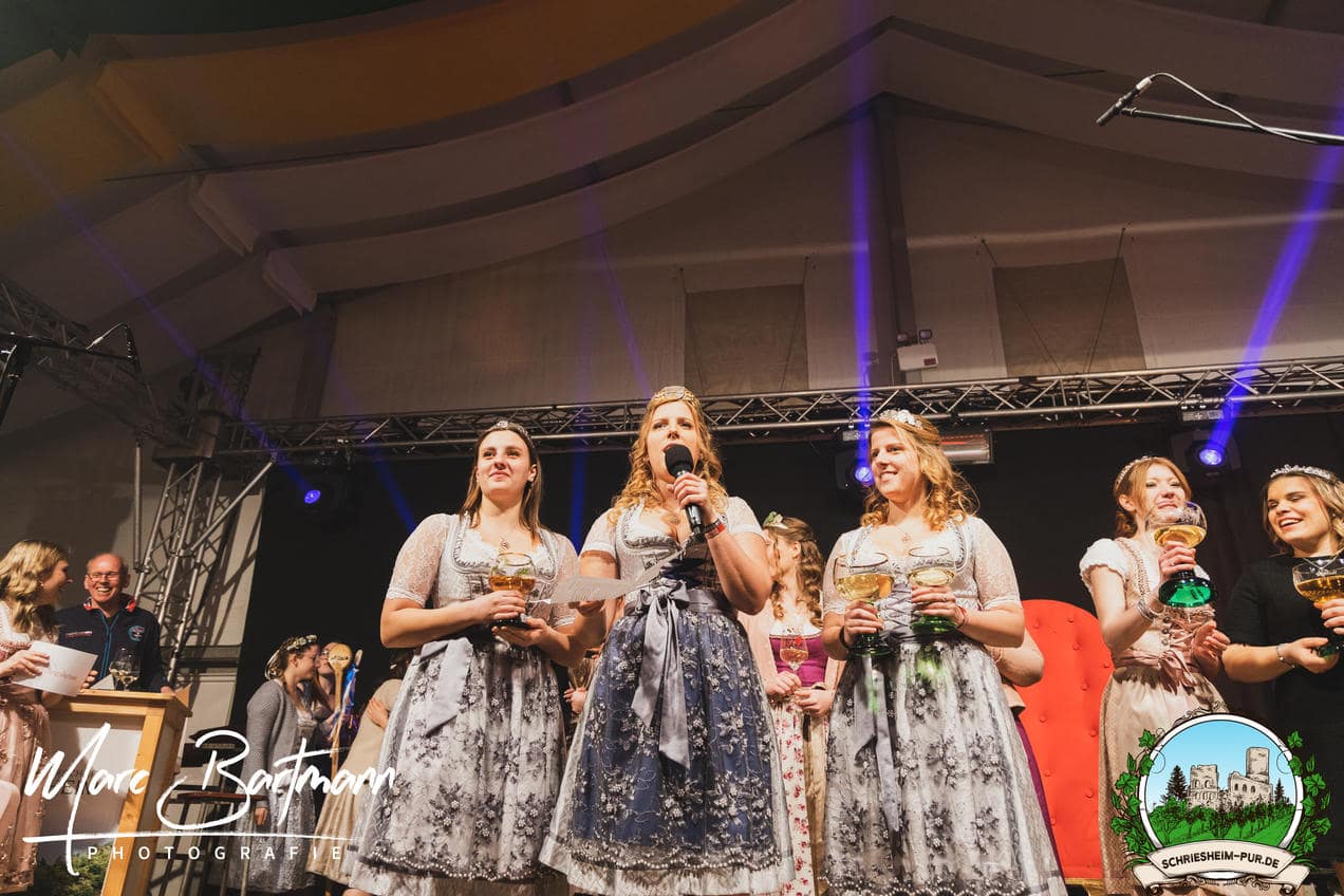 Die neuen Weinhoheiten Miriam Knapp, als Weinkönigin mit den Prinzessinnen Sophie Weil und Ylva Neuert wurden bei der Mathaisemarkteröffnung 2023 durch die Krönung in ihr Amt eingeführt. Endlich wieder im Festzelt auf dem Mathaisemarkt, so wie wir es kennen. Das Jahr davor fand die Krönung noch auf der Ersatzveranstaltung dem Stadtfest Schriesheim statt.