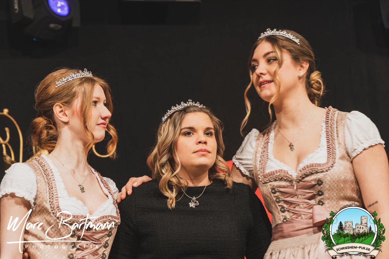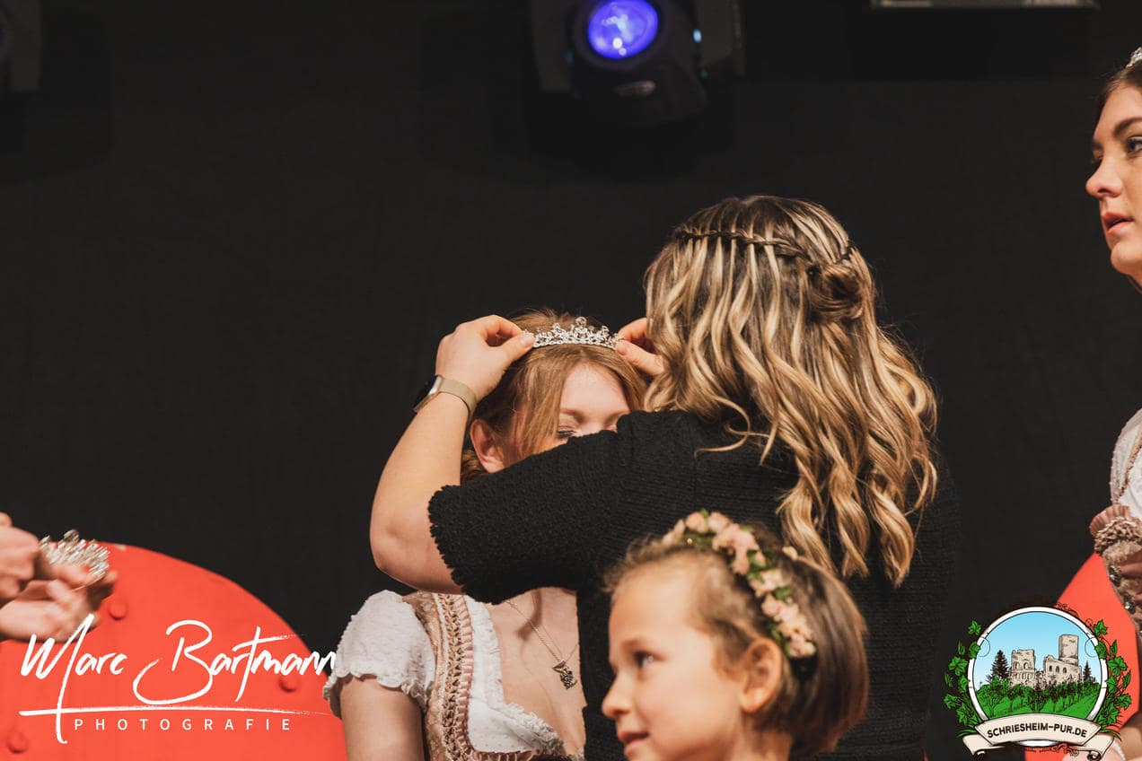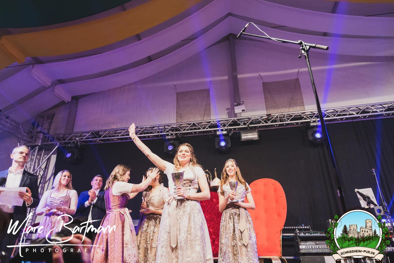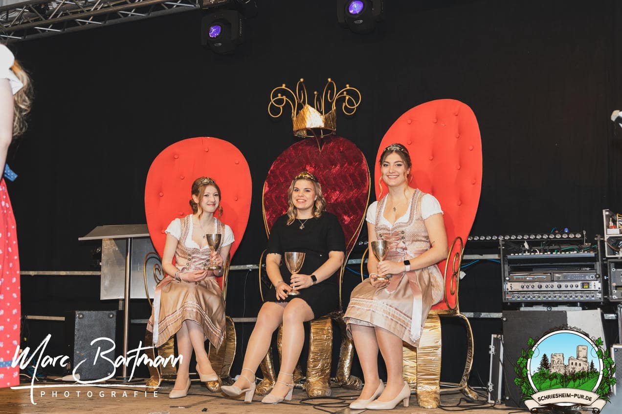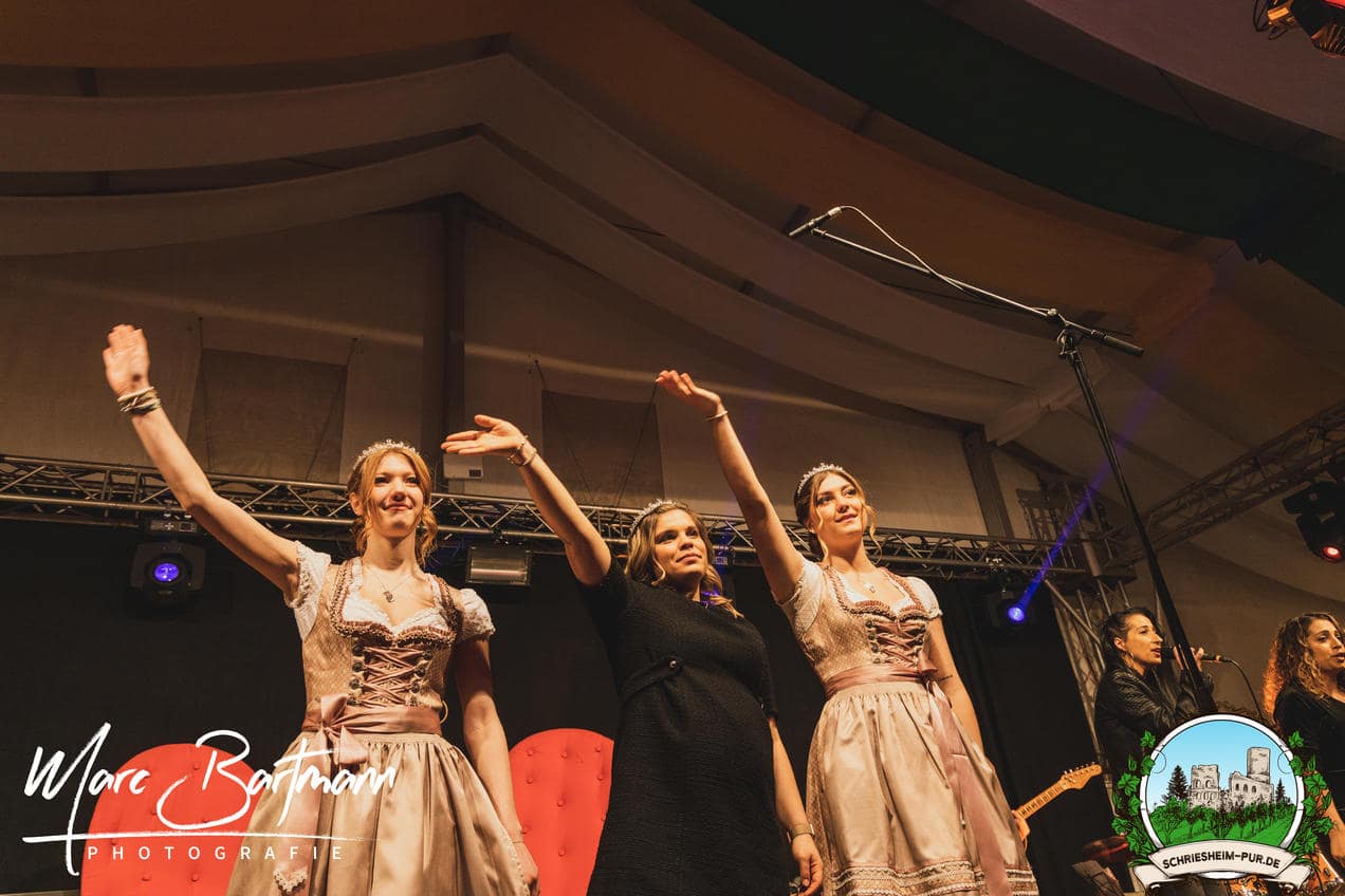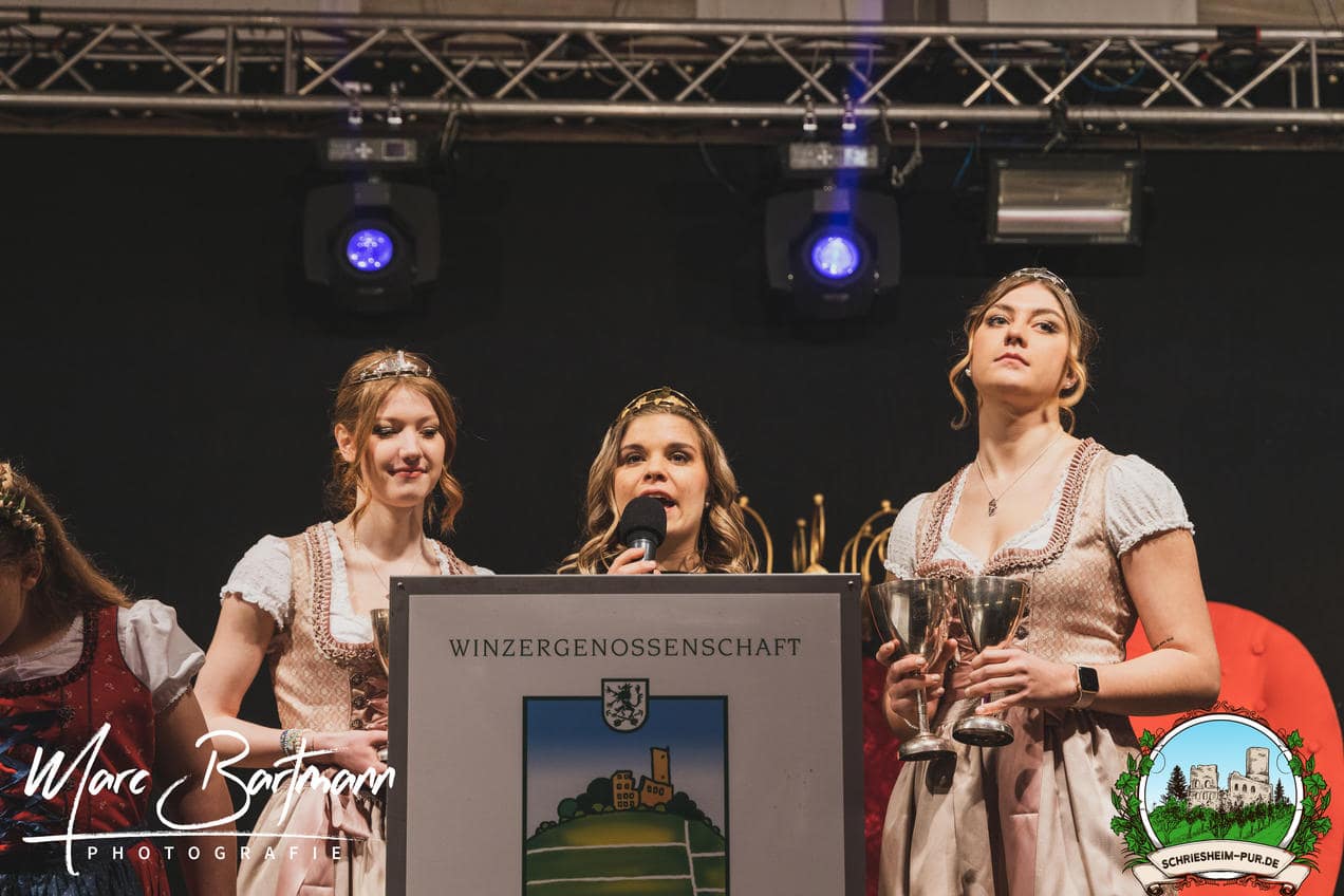 Die neuen Weinhoheiten Miriam Knapp, als Weinkönigin mit den Prinzessinnen Sophie Weil und Ylva Neuert wurden bei der Mathaisemarkteröffnung 2023 durch die Krönung in ihr Amt eingeführt. Endlich wieder im Festzelt auf dem Mathaisemarkt, so wie wir es kennen. Das Jahr davor fand die Krönung noch auf der Ersatzveranstaltung dem Stadtfest Schriesheim statt.