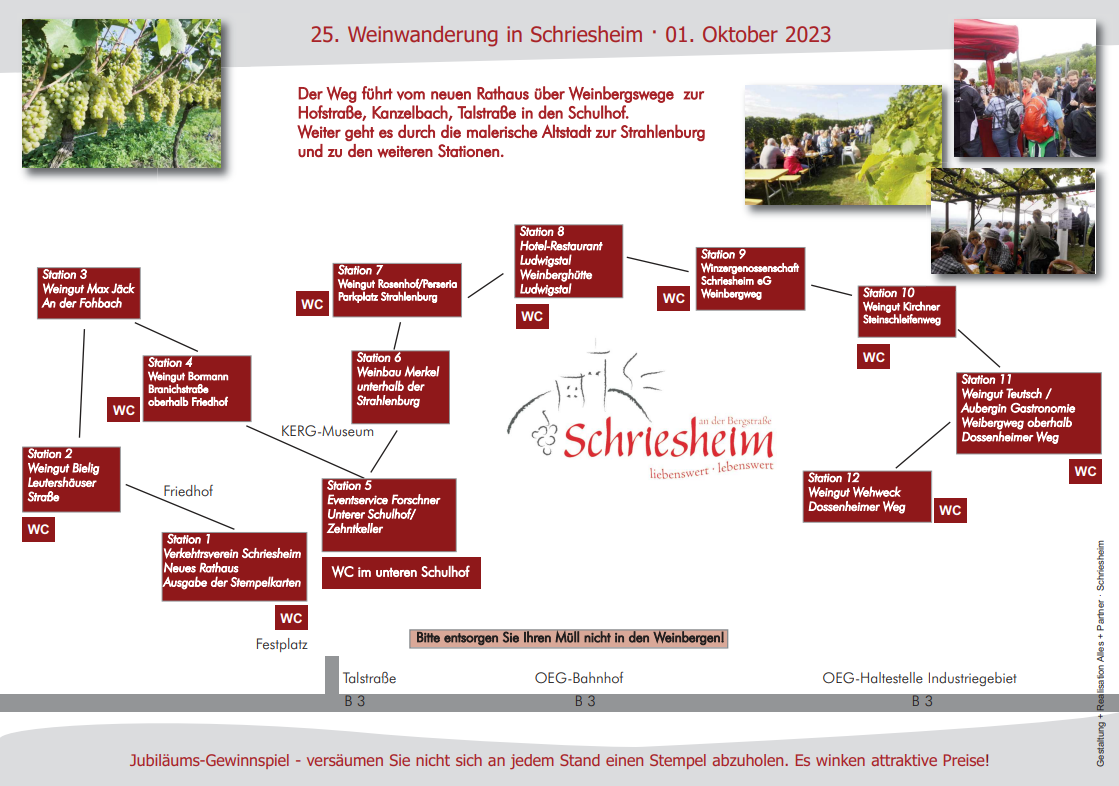 Schriesheimer Weinwanderung Nr 25 2023 – Am 1. Oktober 2023 ist es endlich wieder soweit. die 25. Schriesheimer Weinwanderung 2023 findet satt. Da heißt es feste Schuhe anziehen, Rucksack packen und auf nach Schriesheim, um sich dort, von den Winzern vor Ort verköstigen lassen und deren leckere Weine genießen. Dieses Jahr findet bereits die 25. Weinwanderung in Schriesheim statt. Das heißt es gibt auf jeden Fall etwas zu feiern. Also seit dabei. Alle Informationen findet ihr wie immer hier bei uns. Veranstaltet wird die Weinwanderung wie immer vom Verkehrsverein Schriesheim e.V. in Zusammenarbeit mit unseren Winzern vor Ort. Danke für eure Arbeit!