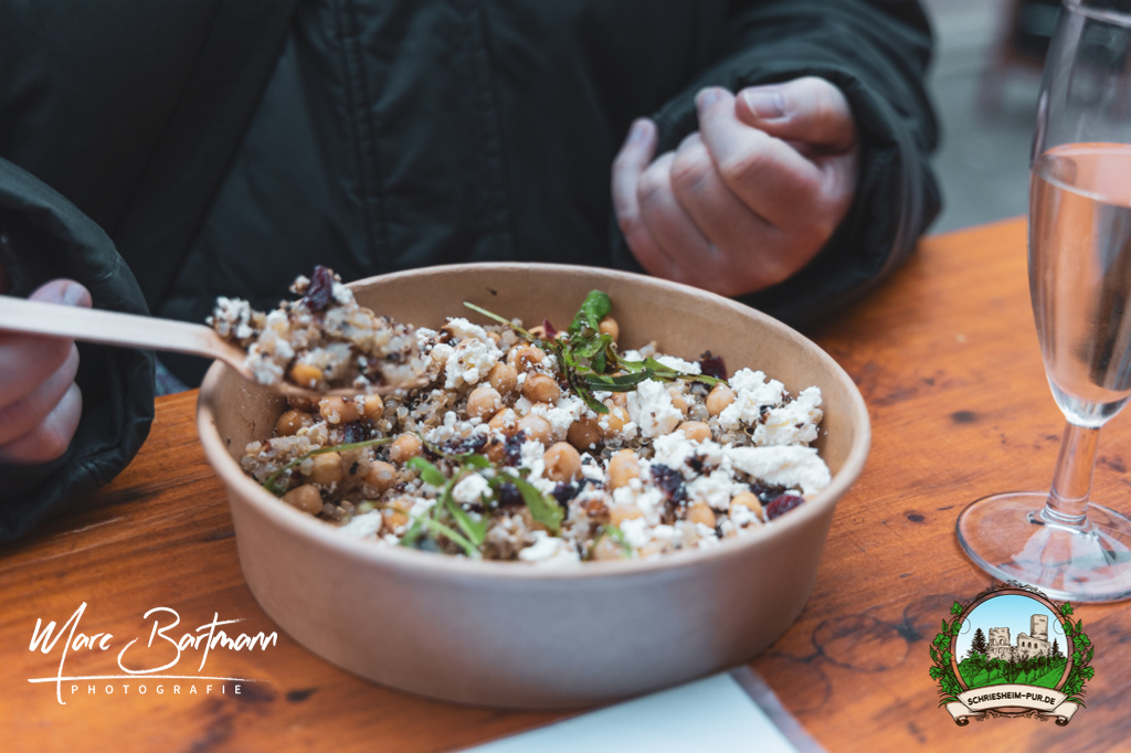 Die Weine, die während der Rotweinwanderung präsentiert wurden, stammten natürlich hauptsächlich aus Schriesheim und der umliegenden Region. Die Winzer zeigten stolz ihre besten Kreationen und ermöglichten den Besuchern, eine Vielzahl von Weine zu verkosten. Die hohe Qualität der Weine trug maßgeblich zur positiven Stimmung bei und sorgte für zufriedene Gesichter unter den Weinliebhabern. Aber auch bei den Gerichten wurde einiges Geboten von Pommes und Schnitzelbrötchen bis zum gesunden Quinoa Salat.