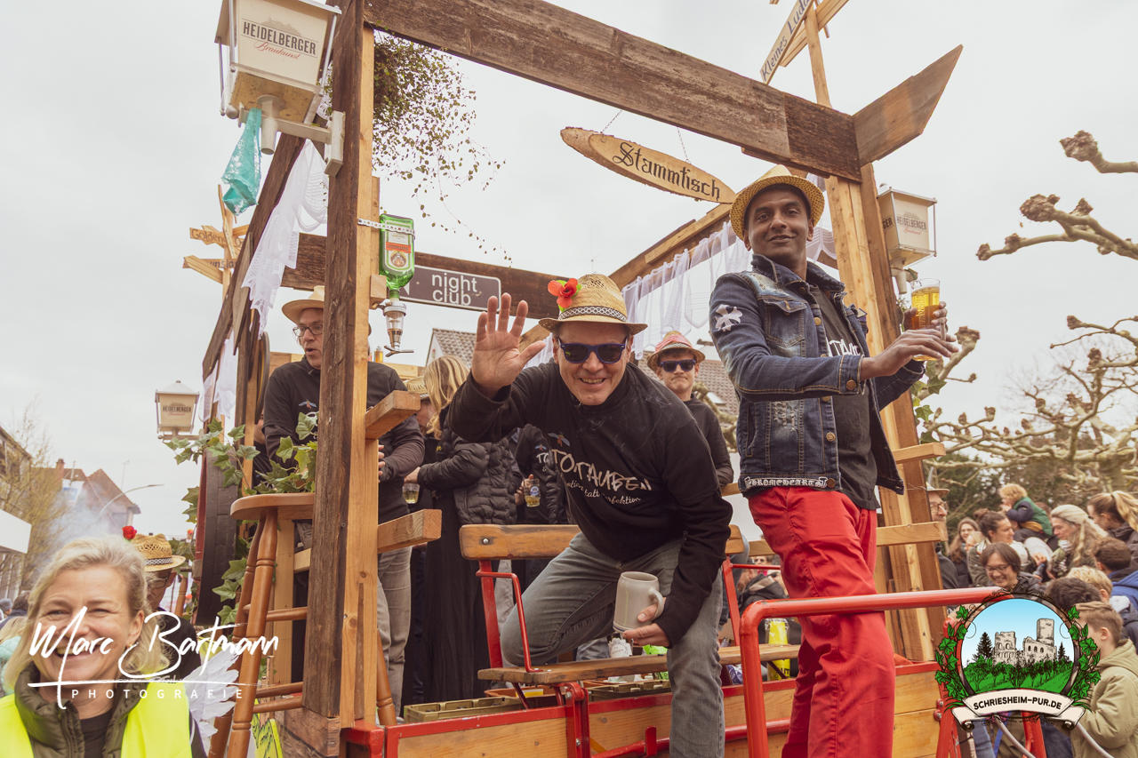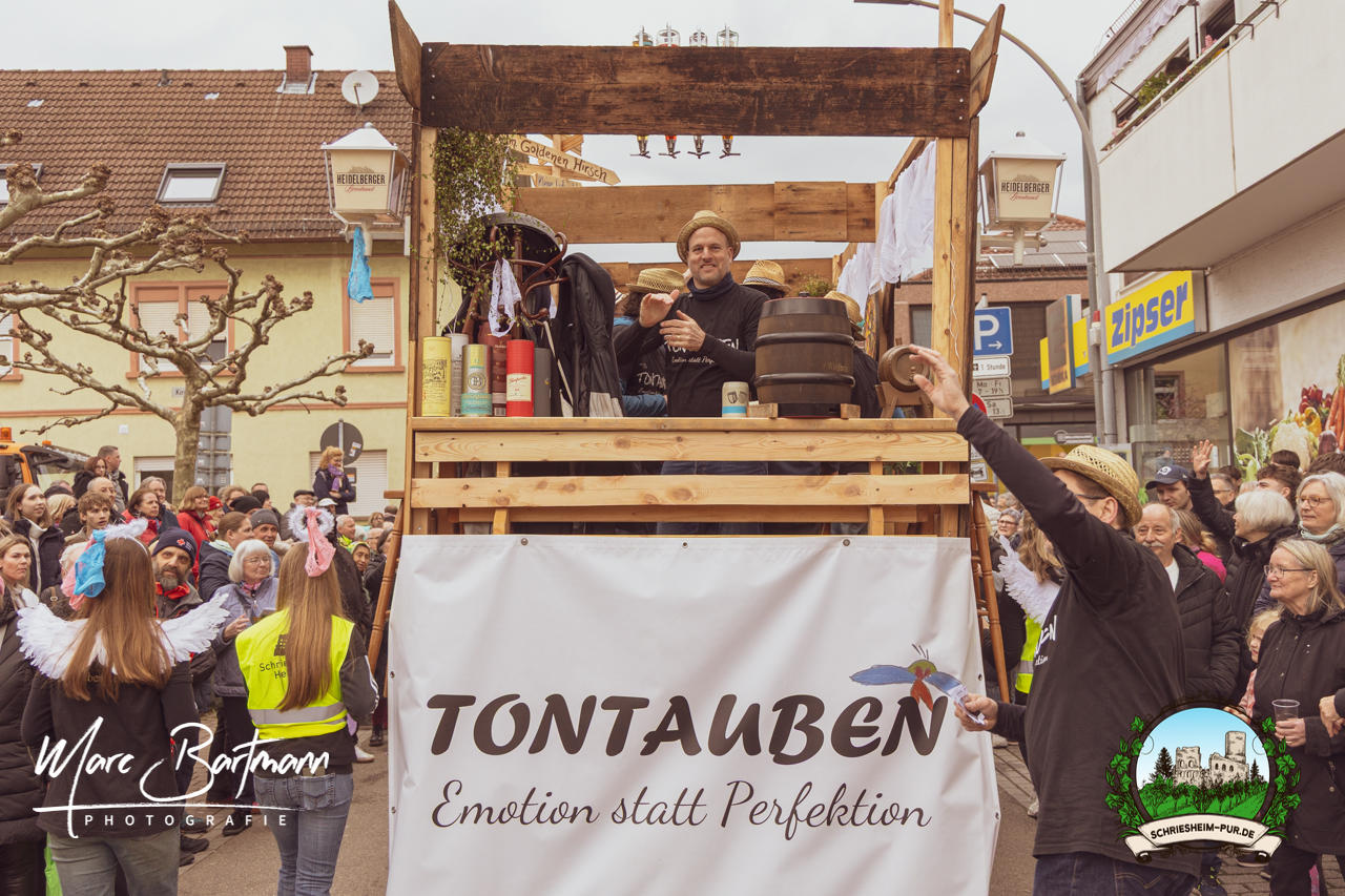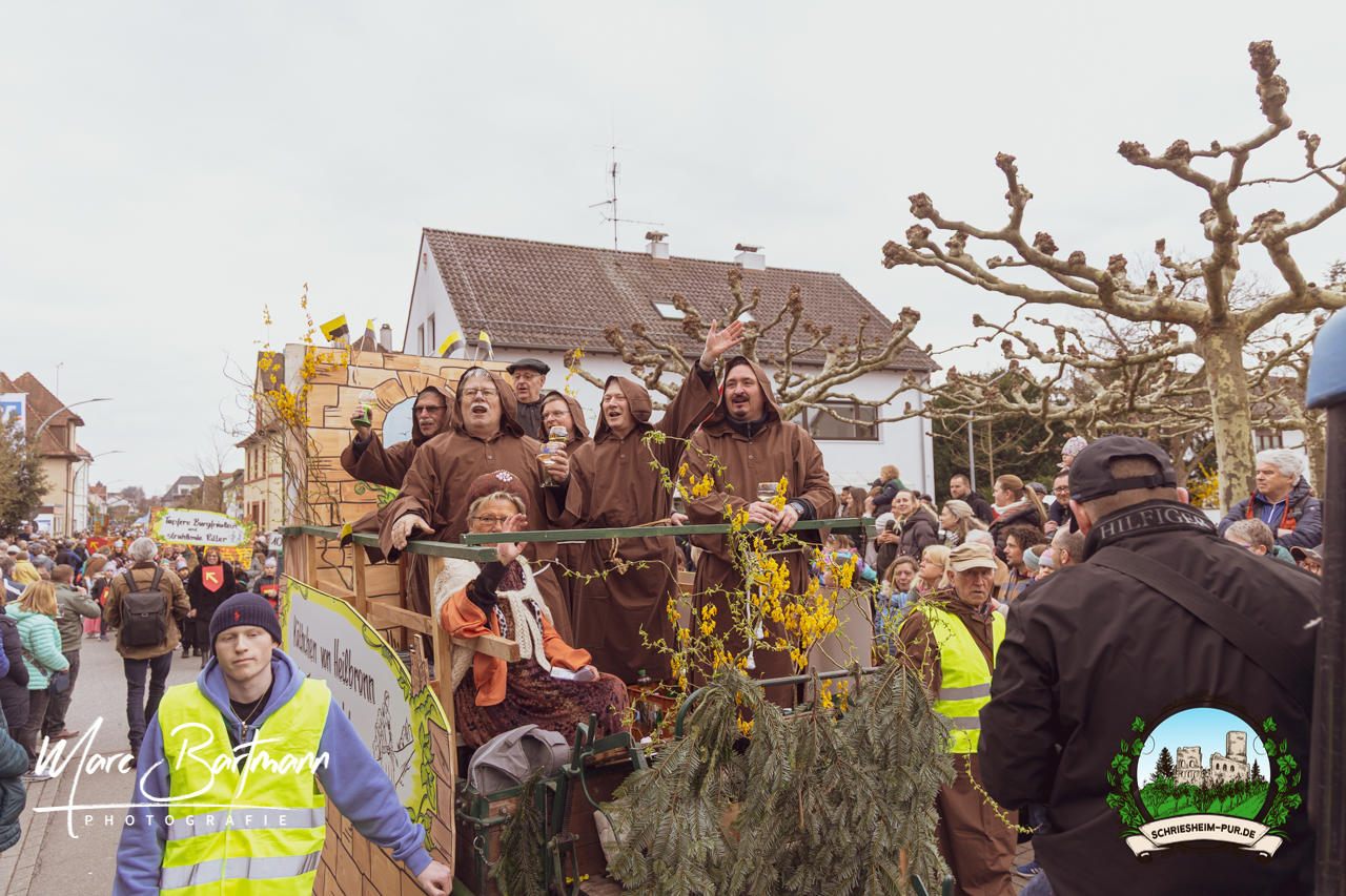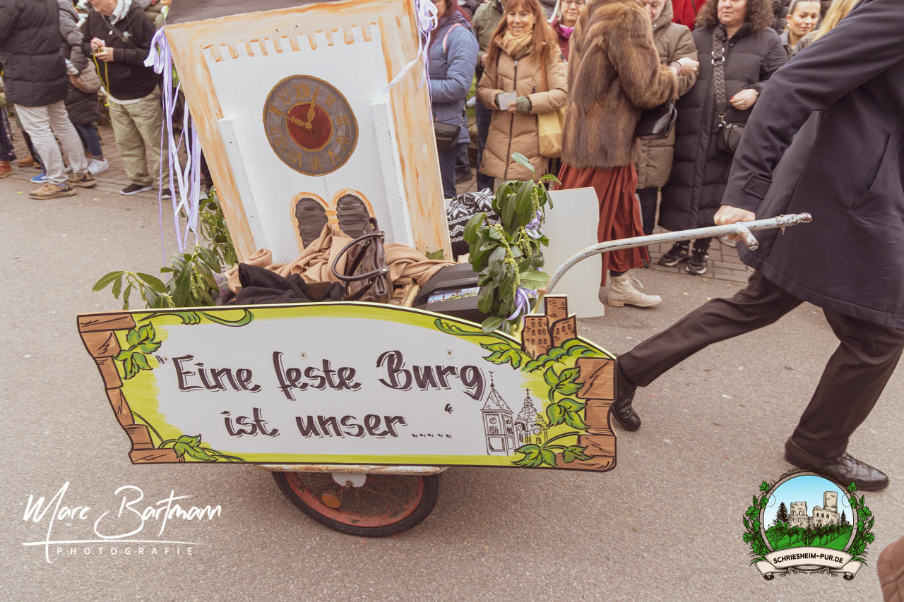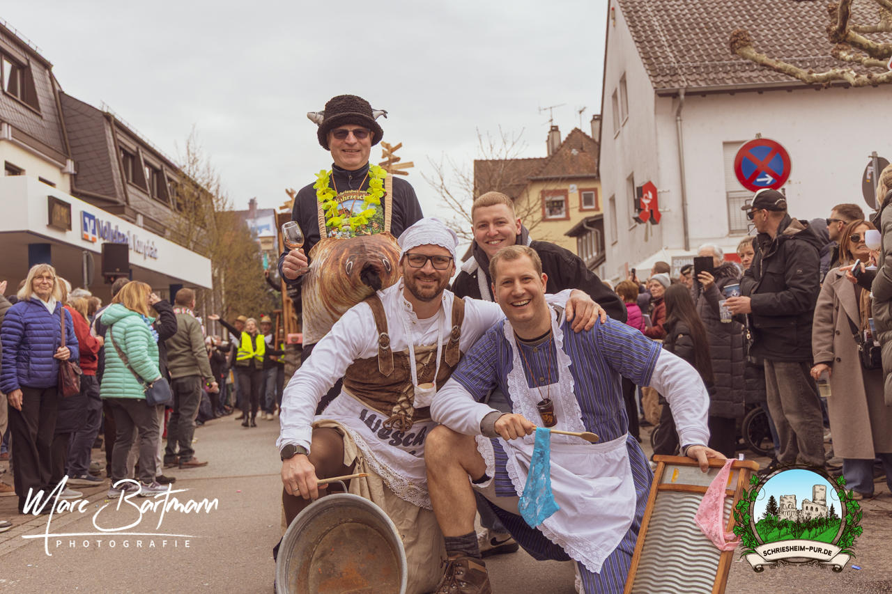 Doch dieses Jahr war alles ein bisschen anders – besser! Der Umzug war lustiger, kreativer und lebendiger als in den Vorjahren. Die Gruppen hatten sichtlich Spaß am Motto „Schriesheimer Wahrzeichen“ und setzten es mit viel Witz und Liebe zum Detail um. Von nachgebauten historischen Gebäuden über humorvolle Interpretationen lokaler Legenden bis hin zu kulinarischen Hommagen an die Region: Hier stimmte einfach alles.